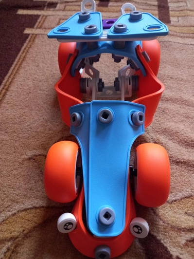 Конструктор гарної якості. Але зібрати деякі вузли доволі нелегко. Тож потрібна допомога дорослого. Якщо ваша дитина полюбляє щось крутити – саме воно. Для малечі – можна гратися і “ремонтувати” вже зібрані моделі, для старших дітей (для яких цей конструктор підійде більше) – можливість конструювати самостійно. Зручно, що є кейс для зберігання. Моделі виходять доволі великі. Побачимо, на скільки вистачить пластичних деталей.