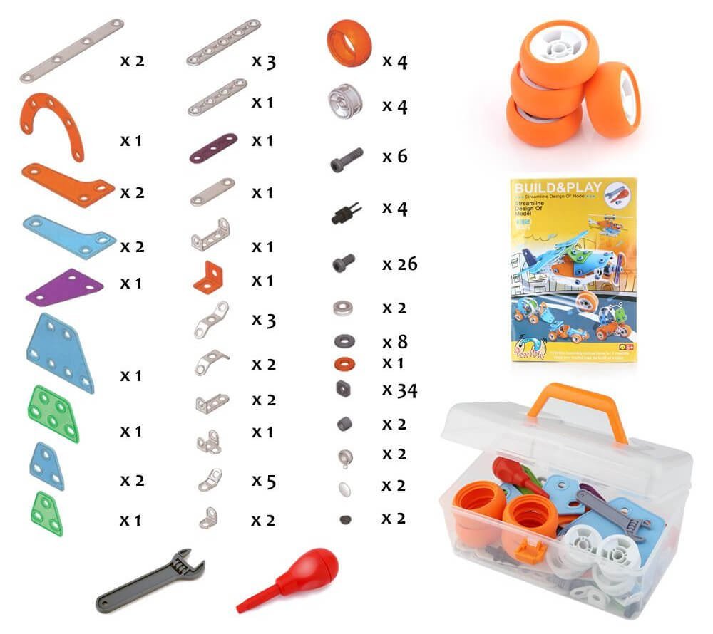 Конструктор дозволяє зібрати 5 різних моделей транспортних засобів (інструкція у комплекті). Складається з великих барвистих деталей, що кріпляться між собою за допомогою болтів. Елементи легко поєднувати між собою. Так само в наборі є гайковий ключ і викрутка для розвитку навичок інженера-початківця.