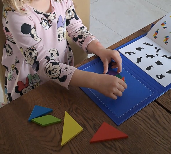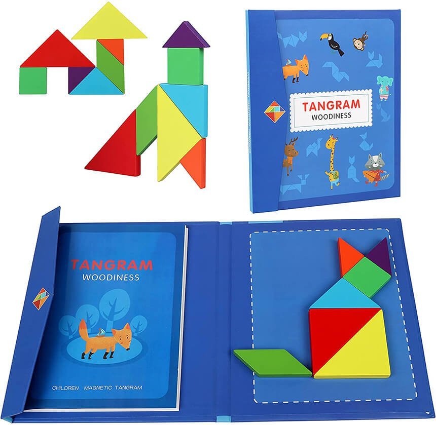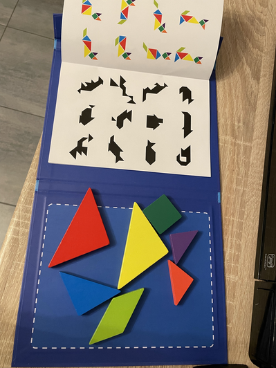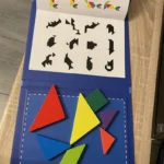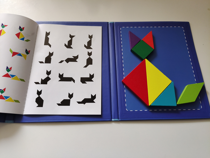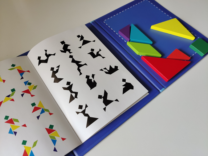 Чудовий подарунок. Діткам подобається виконувати завдання, складати фігурки за власною уявою. Зручно зберігати і брати в дорогу. В першому класі є задачки з використанням танграму, то ж і в початковій школі буде корисним.